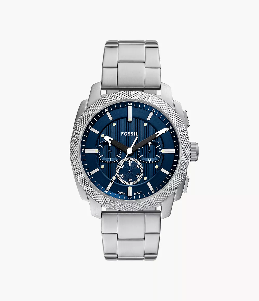 Inspirado en la clásica maquinaria estadounidense, el reloj con cronógrafo Machine llama la atención con su atrevido bisel moleteado. Indiscutiblemente masculino con una atrevida caja de 44 mm que alberga una esfera azul cepillada con detalles con textura, todo ello protegido por un cristal mineral. Con un movimiento de cronógrafo de cuarzo de precisión, este robusto reloj está fabricado para durar con un resistente brazalete de acero inoxidable. Una verdadera declaración de estilo con un diseño de inspiración industrial.