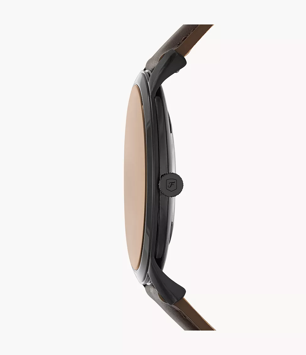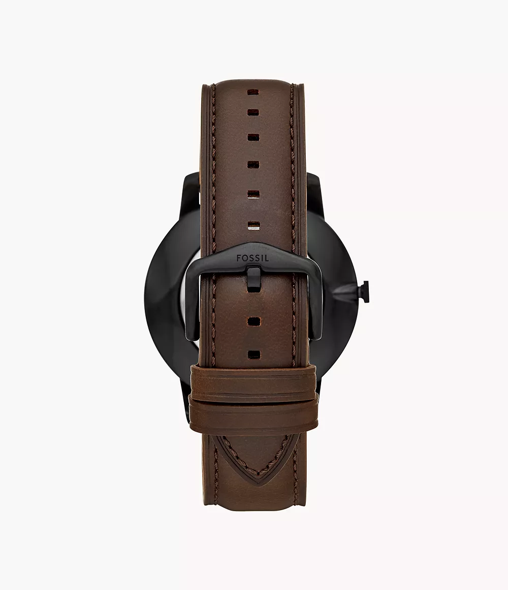El reloj Minimalist de 44 mm tiene una esfera negra con efecto “rayos de sol”, índices de números romanos y lineales, movimiento de tres agujas y una correa de piel marrón.