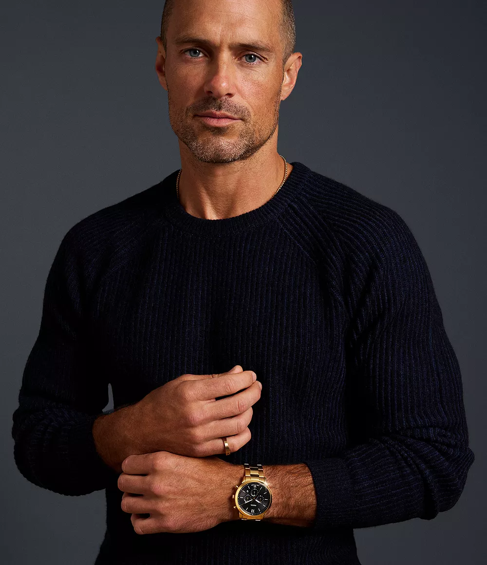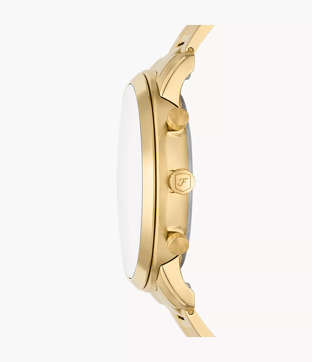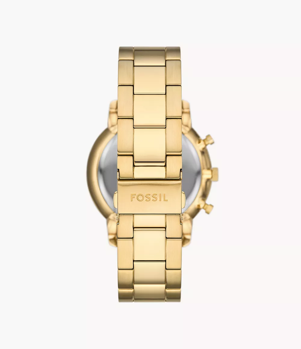 Este reloj Neutra de 44 mm tiene una esfera negra con efecto “rayos de sol”, movimiento de cronógrafo y brazalete de acero inoxidable dorado.